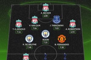 后卫:阿诺德(利物浦,7.16分)、范迪克(利物浦,7.06分)、塔科夫斯基(埃弗顿,7.03分)、罗伯逊(利物浦,6.94分)