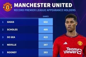 德转列曼联队史英超出场榜: