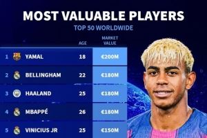 足坛身价TOP50:亚马尔2亿欧居首,贝林、哈兰德、姆巴佩1.8亿欧