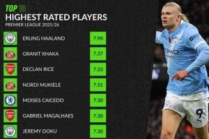 体育资讯11月19日讯 截至目前本赛季英超进行了11轮比赛,WhoScored列球员评分榜,哈兰德7.90居首,扎卡7.37第二。